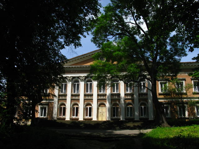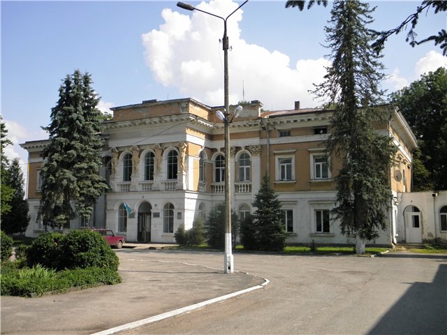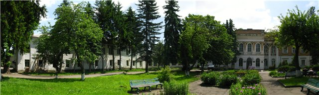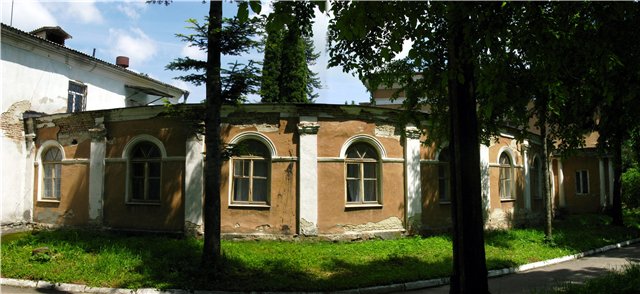 Палац і старі флігелі утворюють широкий двір-курдонер. Від головного фасаду кленова алея веде до Троїцького собору. Посеред алеї є колодязь, оточений п'ятьма віковічними кленами. Колись палац мав розкішні парадні зали з ампірними розписами на стелі. Тепер розписів немає. Стіни поштукатурили і пофарбували.