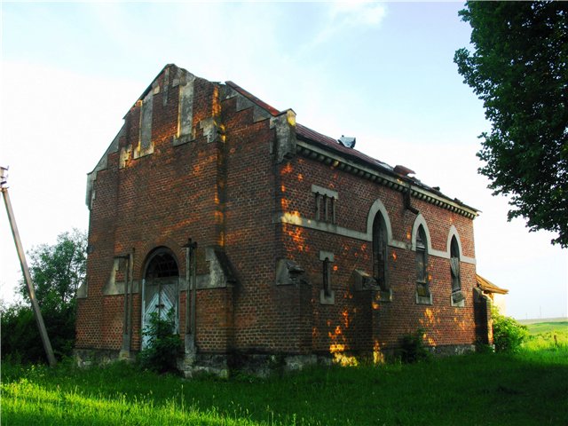 І дійсно, в костел ніхто не ходить вже більше 50 років. Храм, що був збудований з червоної цегли (припускаю, у неоготичному стилі) на початку ХХ століття, після війни був закритий і переобладнаний на склад. Так склад тут знаходиться і по сьогодні.